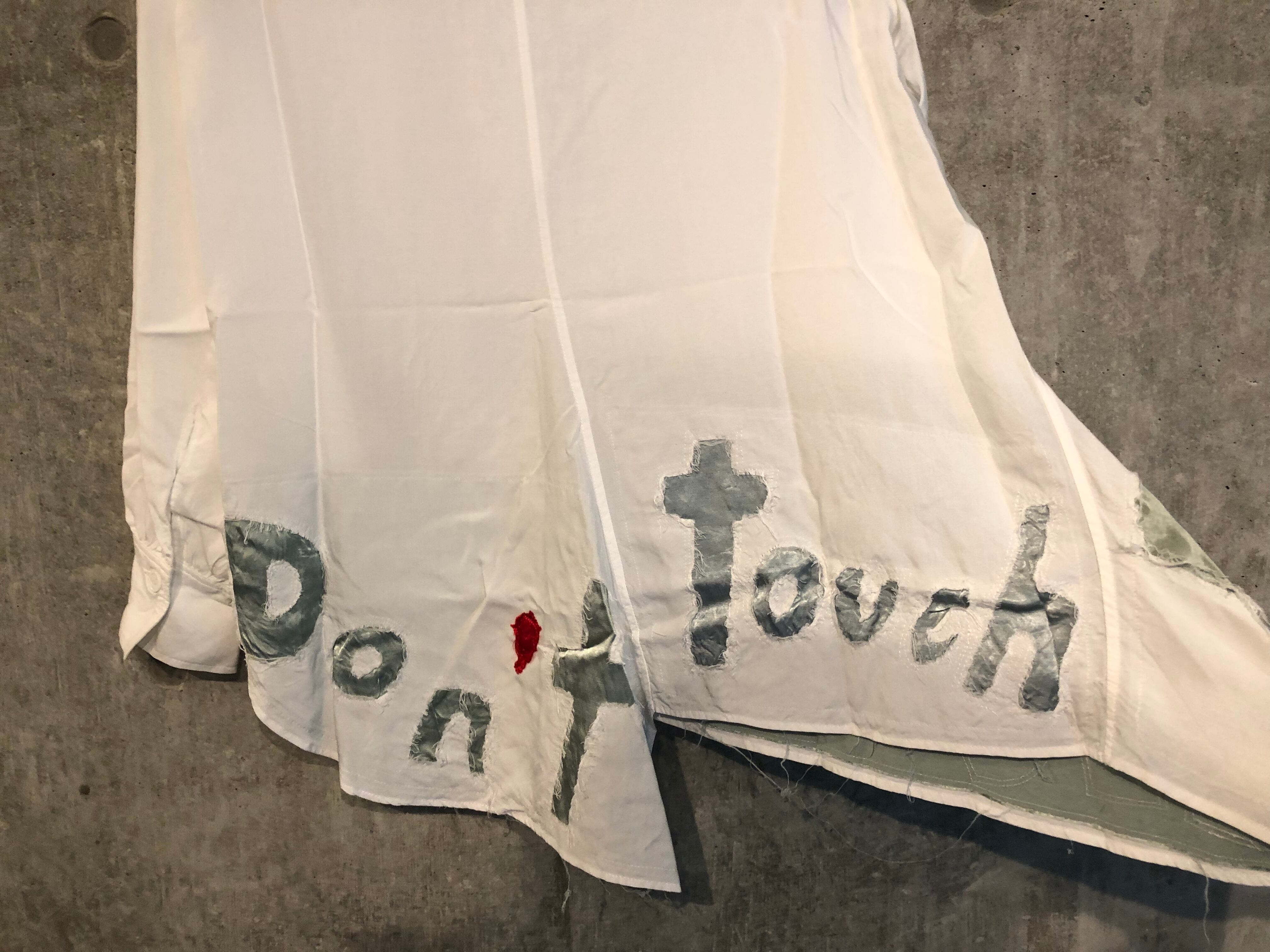 とてもデザイン性が高くなっており、左胸あたりはパッチワークデザイン、前右裾から後ろ裾にかけては「Don’t touch me」とパッチワークでデザインされており大変インパクトのある仕上がりになっております。