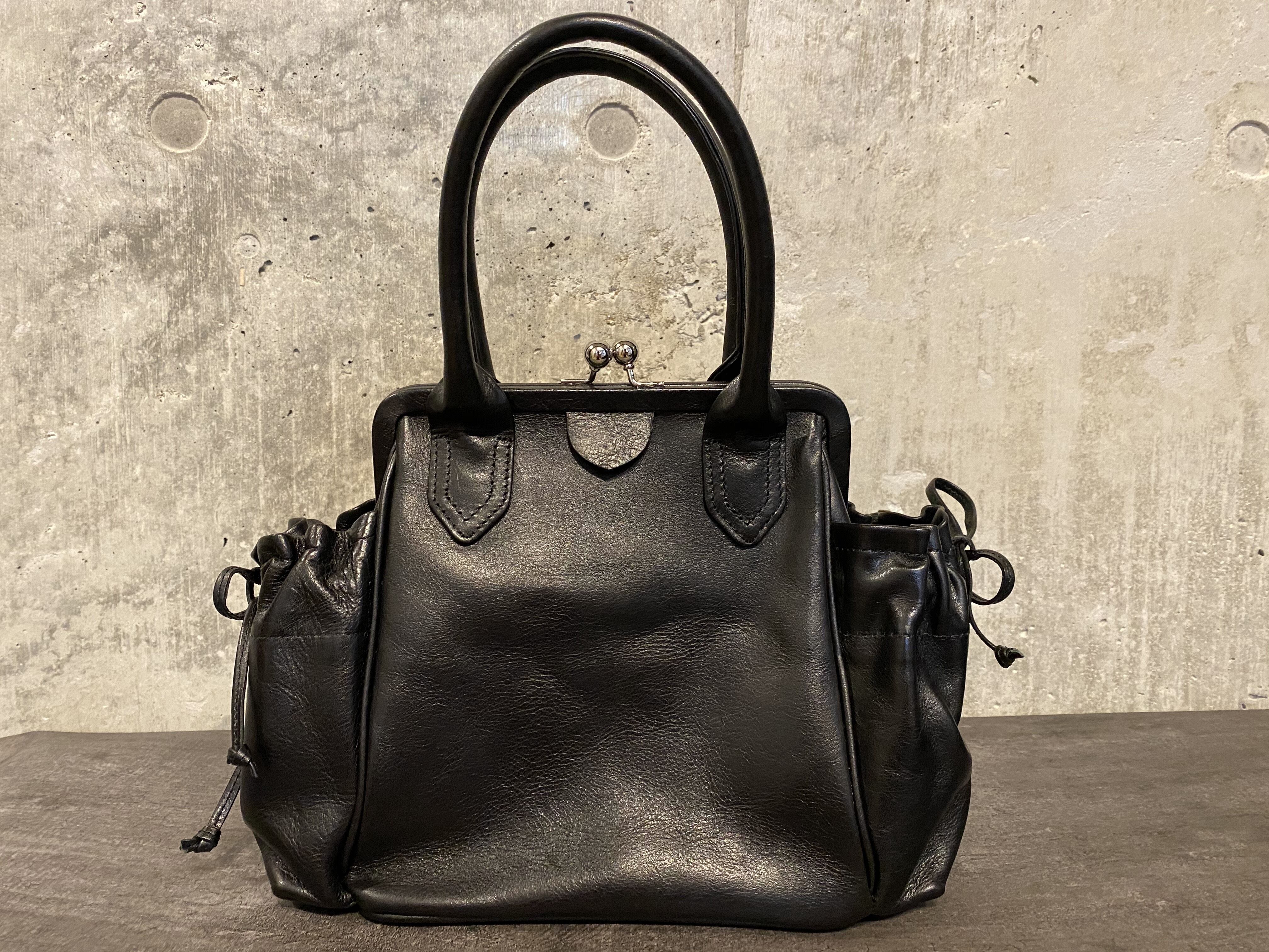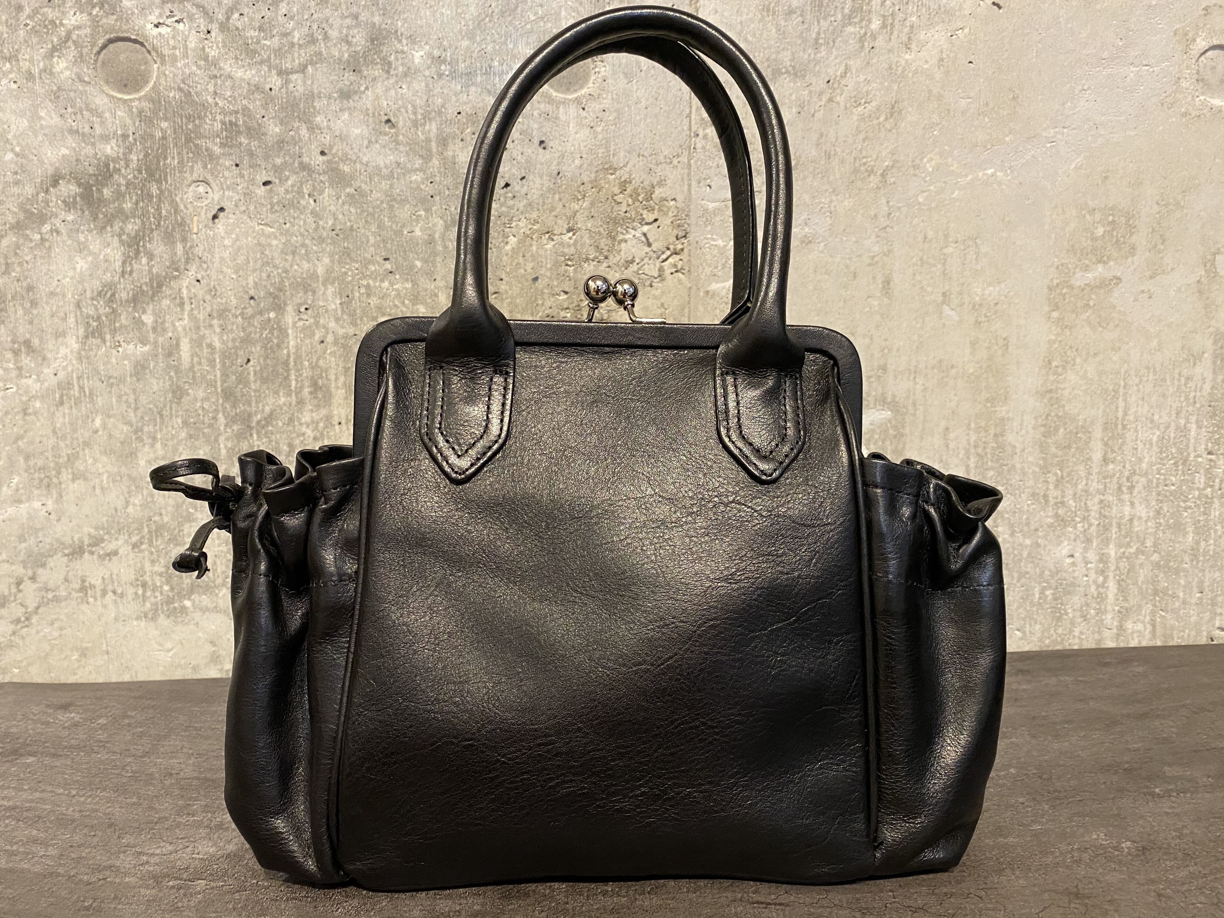 極美品 ヨウジヤマモト 半艶スムースレザー がま口 サイド巾着 ショルダー付き ハンドバッグ #[731]