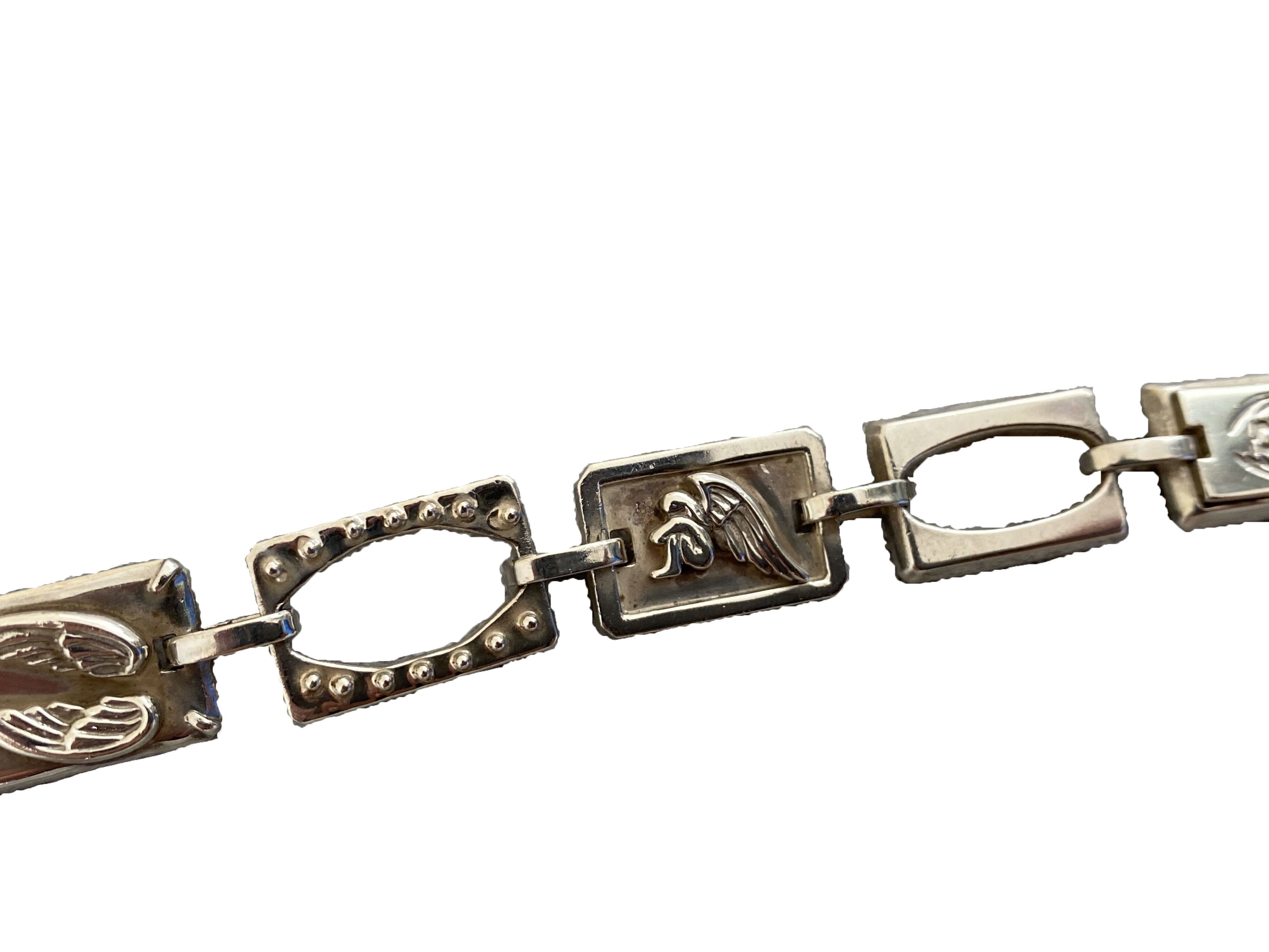 エンジェルやデビル、エンジェルの羽など様々なデザインが繋がれた特徴的なオールシルバーのチェーンブレスレットです。